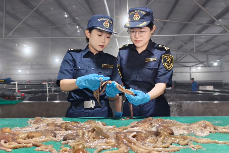 圖為:海關(guān)關(guān)員在車間現(xiàn)場查驗(yàn)出口活章魚 張博寧/攝