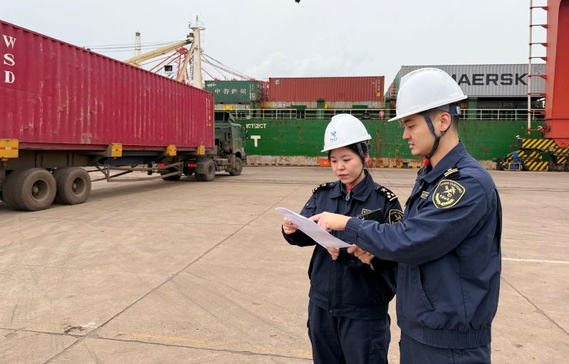 圖為:海關(guān)關(guān)員對(duì)內(nèi)支線貨物進(jìn)行現(xiàn)場監(jiān)管 李想/攝