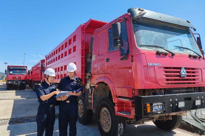 圖為:海關(guān)關(guān)員對出口工程車進行現(xiàn)場查驗 韓云婷/攝