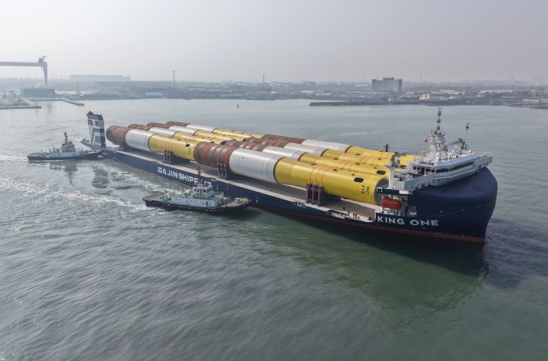 圖為:KING ONE輪裝載8根大型風電單樁發(fā)運出口 韓振禹/攝