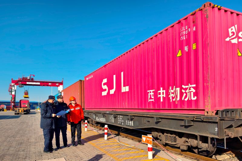 圖為:海關(guān)關(guān)員對運抵港口的鐵路專列進(jìn)行現(xiàn)場監(jiān)管 封磊/攝