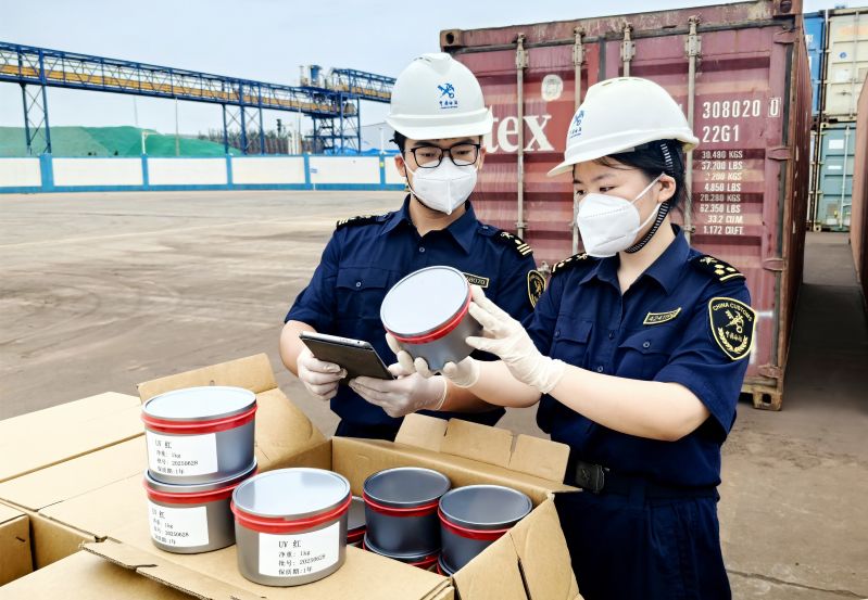 圖為:海關(guān)關(guān)員對“涉危不報”油墨進行現(xiàn)場監(jiān)管 劉浩男/攝