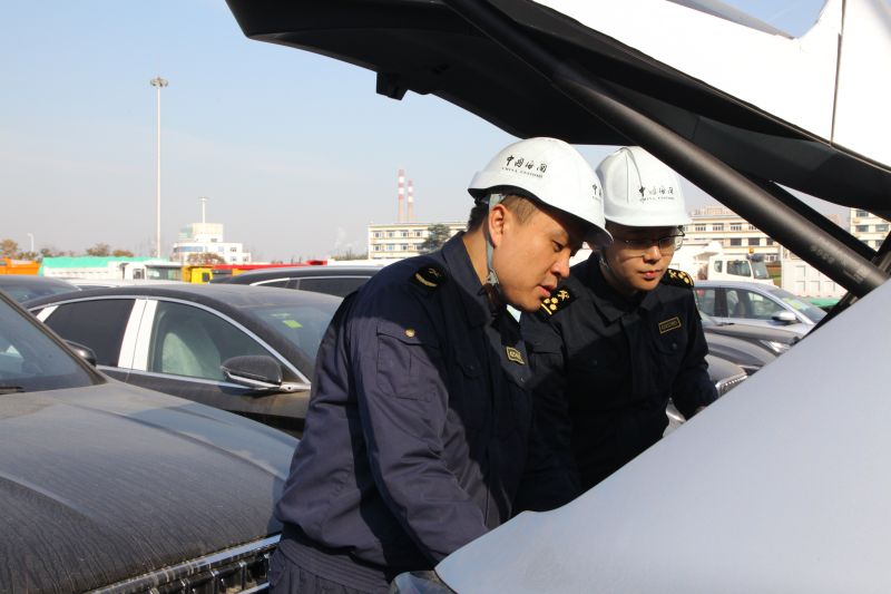 圖為:海關關員現(xiàn)場監(jiān)管出口新能源車 李琳/攝