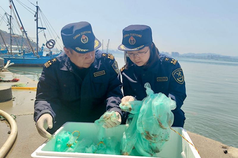 圖為:海關(guān)關(guān)員對(duì)出口貝苗進(jìn)行現(xiàn)場(chǎng)查驗(yàn) 林影/攝