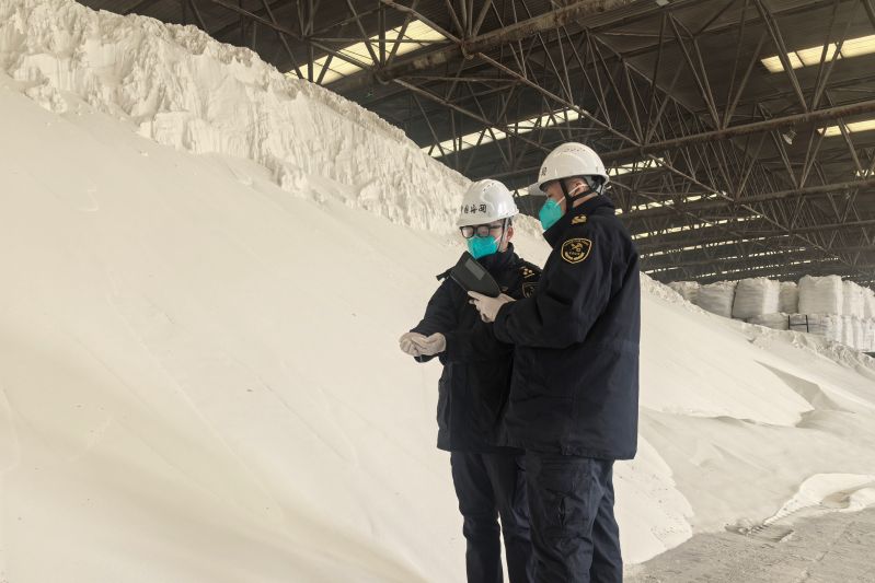 圖為:海關(guān)關(guān)員對進(jìn)口化肥進(jìn)行現(xiàn)場查驗(yàn) 關(guān)景元/攝