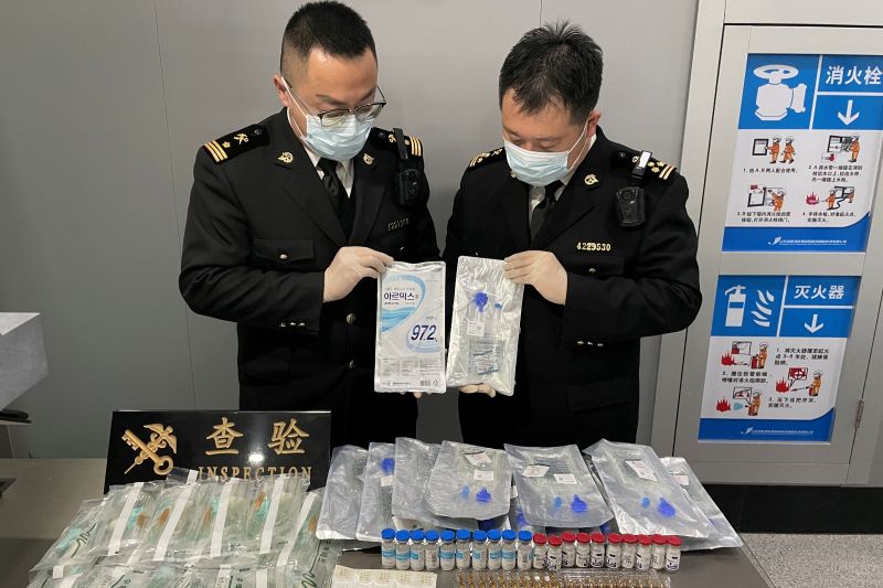 圖為:海關關員查獲針劑等醫(yī)療用品 王天賜/攝
