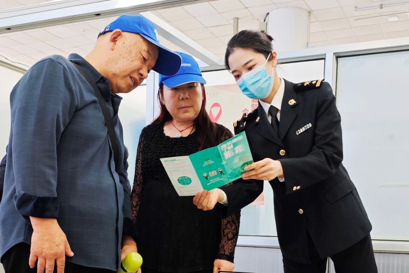 圖為:海關(guān)關(guān)員向入境旅客講解傳染病防控知識(shí) 林森/攝