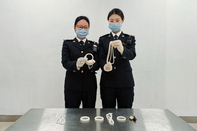 海關關員在對入境航班進行行李物品監(jiān)管時,發(fā)現(xiàn)3名旅客行李CT機圖像顯示異常。經(jīng)開箱查驗,發(fā)現(xiàn)行李中有手鐲、項鏈等疑似硨磲飾品8件,共計574.34g。經(jīng)鑒定,查獲的飾品均為雙殼綱簾蛤目硨磲科物種制品。