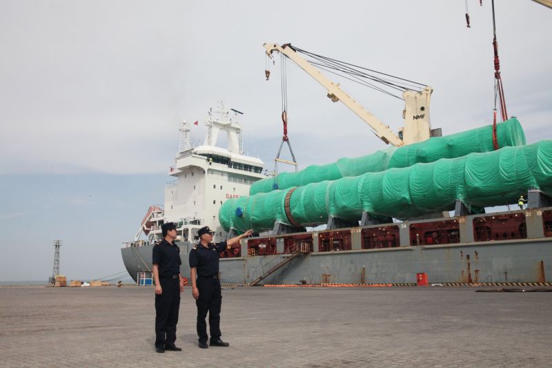 圖為:海關(guān)關(guān)員監(jiān)管塔器設(shè)備出口 孫偉航/攝